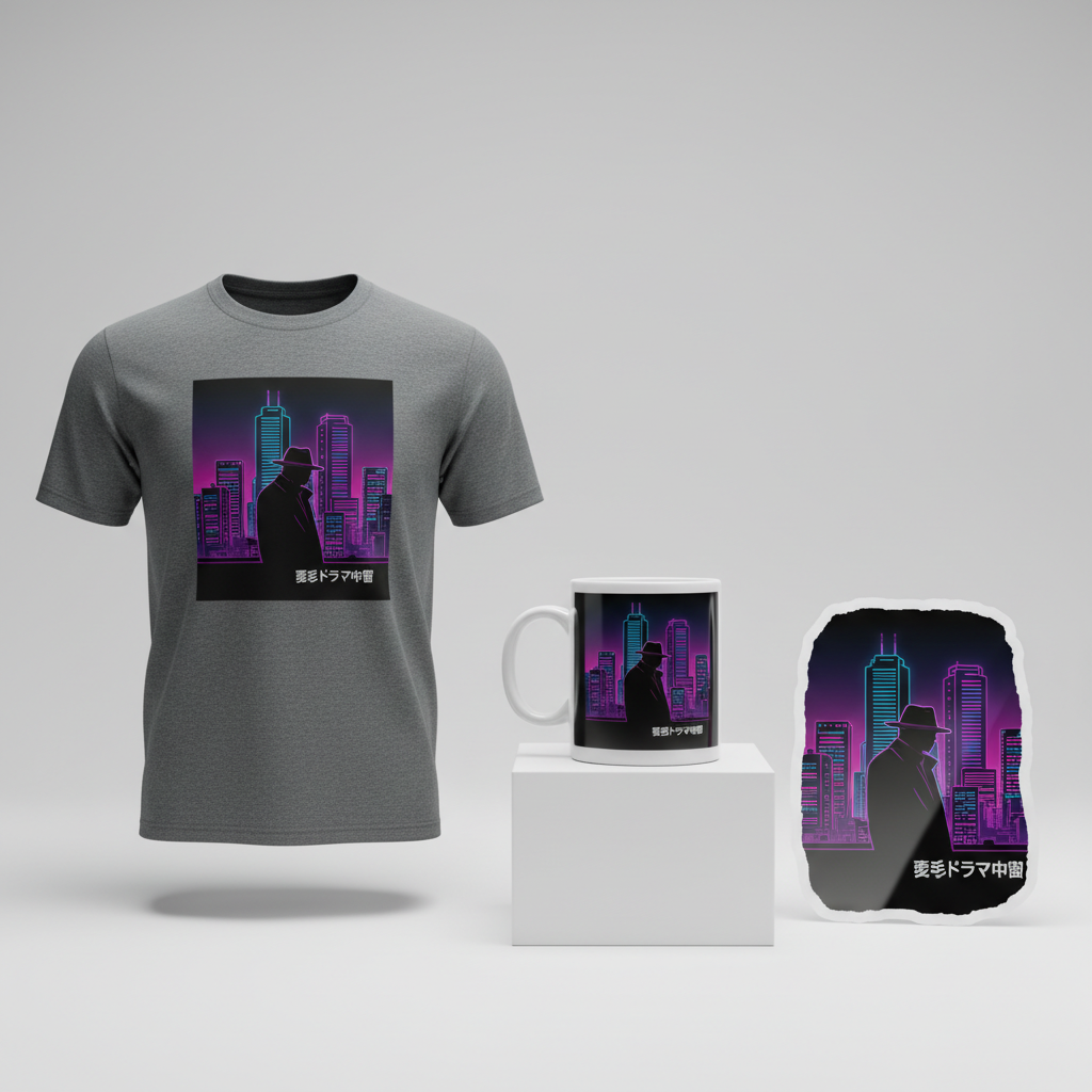 - ✍️ Typography Ideas: Complementing the visual, the Japanese text “刑事ドラマ中毒” (Keiji Dorama Chūdoku), which translates to “Detective Drama Addict,” offers a direct and relatable message to the target audience. For typography, a font that echoes the 80s digital or slightly futuristic vibe would pair perfectly with the city pop aesthetic, perhaps a clean sans-serif with subtle electronic hints, or even a bold, slightly condensed look that feels both retro and modern. The placement of the text could be integrated seamlessly into the neon lights of the city or positioned boldly above or below the silhouette.
