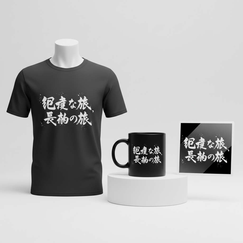 Dark apparel, such as black or dark gray t-shirts and hoodies, provides the perfect backdrop for the design’s stark white or fiery red Japanese calligraphy. The high contrast not only makes the text visually pop but also enhances the rugged, bold aesthetic, perfectly mirroring the adventurous and often intense nature of Maruyama Gonzales’s work.