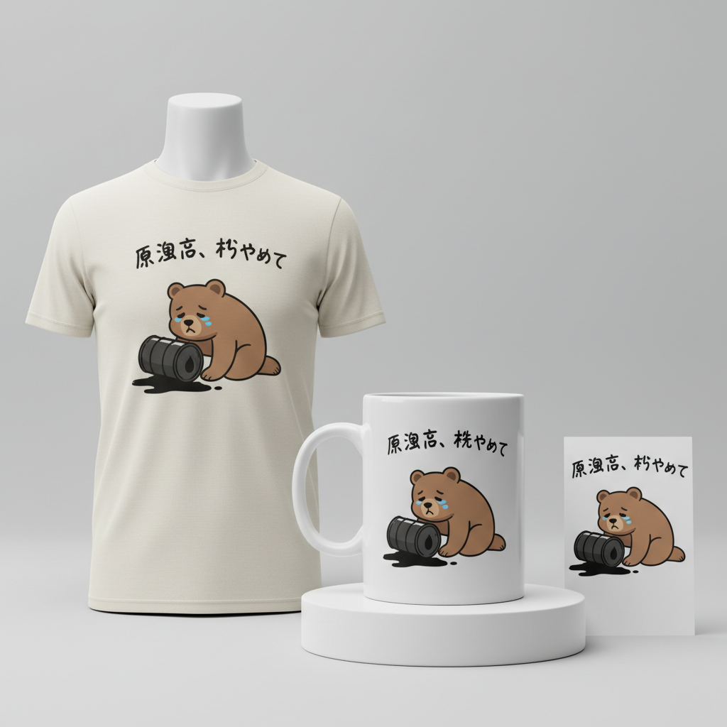 While the immediate trigger for this design is current volatility, the core sentiment of investor frustration with “high oil prices and low stocks” is a recurring theme in global economics. The design’s strength lies in its universal appeal to the shared plight of investors, making it relevant beyond just the immediate news cycle. As long as market volatility and commodity price impacts on investments remain a concern, the underlying message will resonate. Furthermore, the charmingly sad bear and the relatable Japanese phrase give it an enduring quality as a humorous commentary on the investment journey itself.