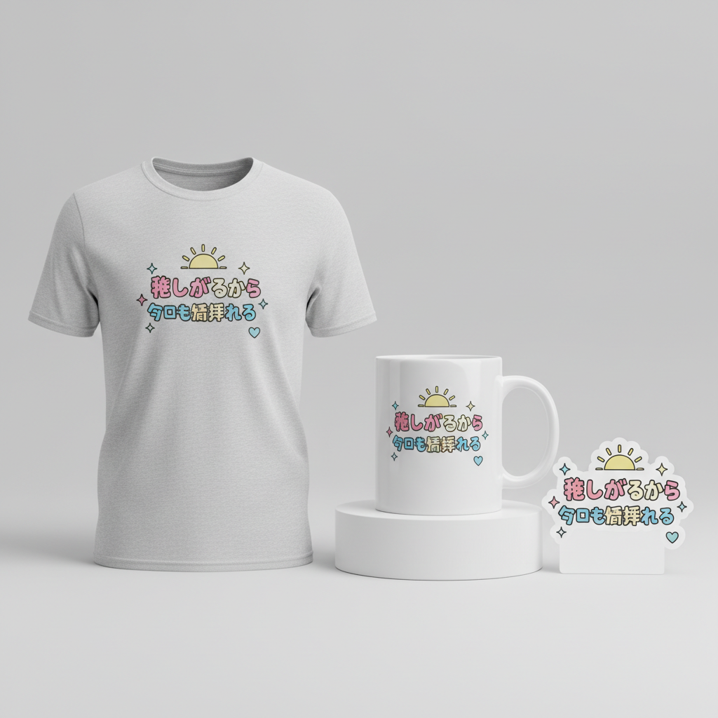 This design strategy masterfully pivots from a potentially high-copyright-risk event involving a specific idol and TV show to the expansive and evergreen niche of Japanese ‘Oshi’ fan culture. The chosen phrase, “Because I have my Oshi, I can do my best today,” is a widely recognized and cherished sentiment among all idol fans, transcending specific groups or individuals. This approach taps into the deep emotional connection fans have with their favorite idols, providing a product that captures the spirit of inspiration and motivation derived from the original trend (getting morning energy from an idol) without infringing on any intellectual property. The ‘kawaii’ design aesthetic directly targets the demographic of J-pop and idol fans, who frequently appreciate and engage with cute and uplifting merchandise. The purchase becomes an expression of personal devotion and a daily affirmation, resonating on a profoundly personal level with the target audience.