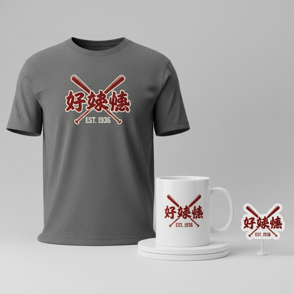 - 🎨 Visual Style: The design evokes a classic, authentic Japanese baseball (Yakyu) feel. It features two traditional baseball bats crossed subtly behind the main text, a timeless emblem of the game. The color palette is deliberately classic: bold red paired with an off-white or cream, conjuring images of vintage uniforms and timeless sports memorabilia. This combination exudes nostalgia and a sophisticated sense of history.