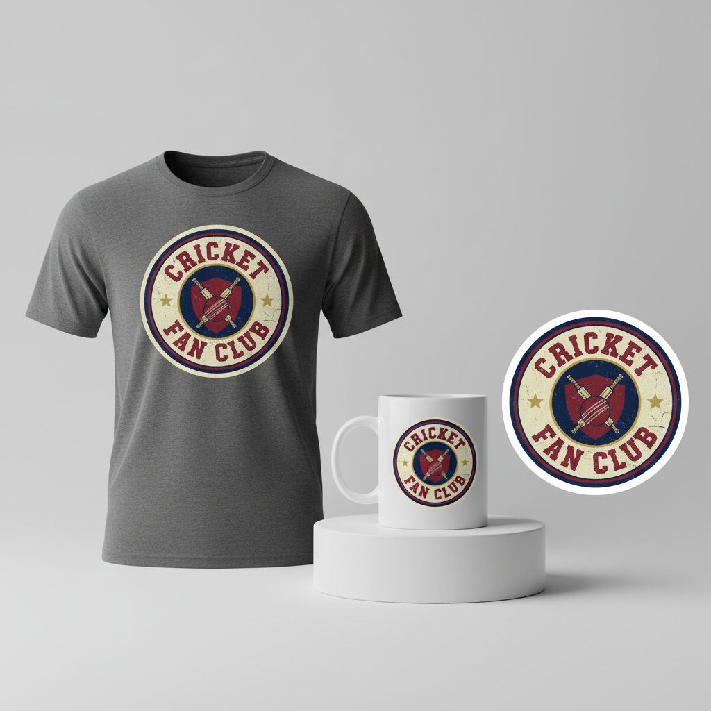 Copyright Evaluation: The design uses generic text and common symbols (shield, crossed bats). The phrase ‘Cricket Fan Club’ is descriptive and not trademarked. The style is a parody of a broad aesthetic (university logos) rather than a specific copyrighted entity, which is a safe and established POD practice.