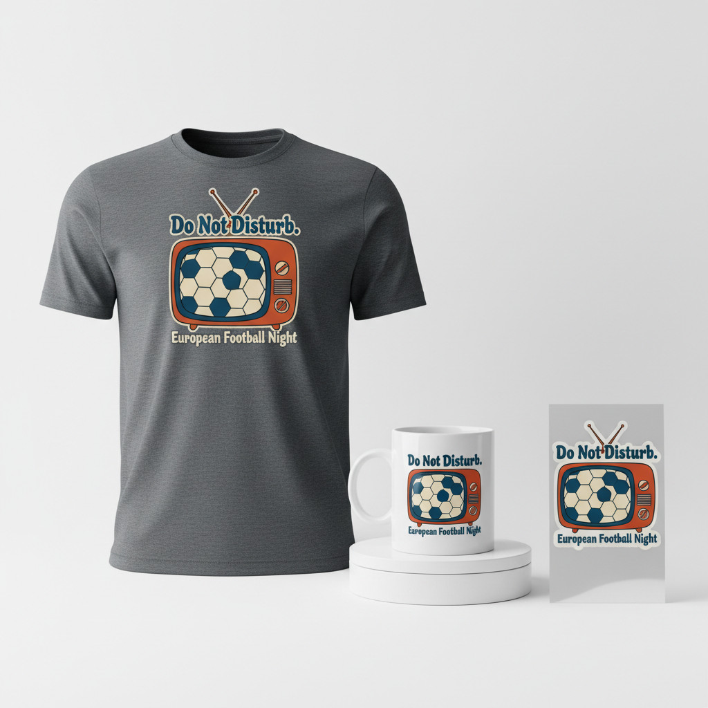 This design ingeniously side-steps IP issues by focusing on generic, universally recognizable elements of the football viewing experience rather than protected brand names or logos. “European Football” is a generic term, and a vintage television with a football pattern, coupled with the phrase “Do Not Disturb. European Football Night,” invokes a mood and a ritual without using official league names, team emblems, or specific player likenesses. It’s all about the feeling, not the trademarked entities.
