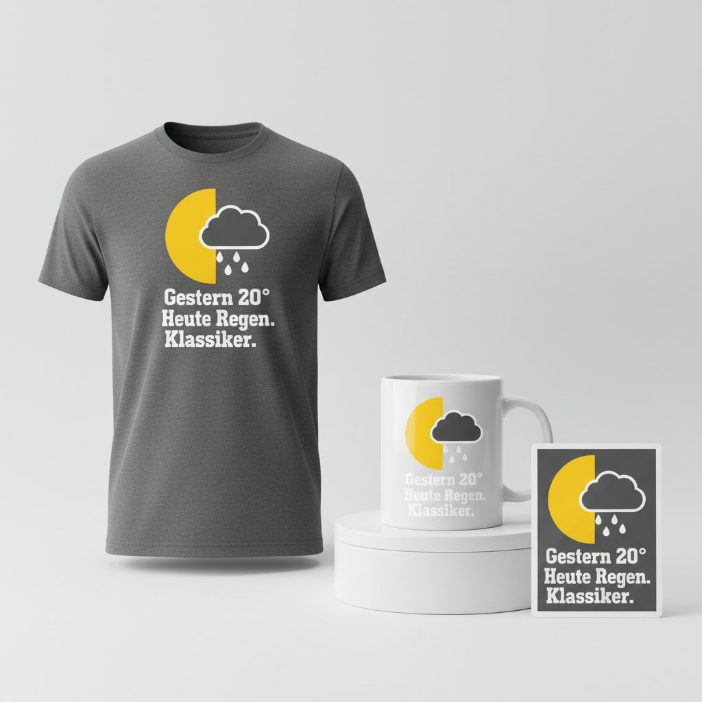 The brilliance lies in the phrase “Klassiker.” While the specific 20-degree-to-rain scenario might be current news, the sentiment of Germany’s wildly unpredictable weather—and the common complaint about it—is a perennial topic. By concluding the statement with “Klassiker,” the design elevates a momentary weather event into a humorous, universally acknowledged truth about the German climate, making it relatable and relevant regardless of the season.