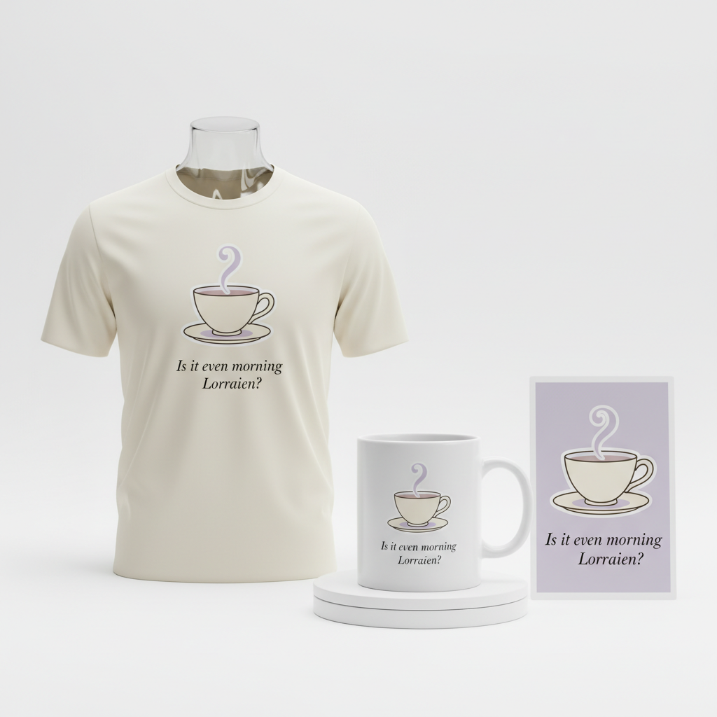 - 🎨 Visual Style: The design embraces a minimalist and elegant aesthetic, perfect for capturing the gentle morning mood. It features a beautifully stylized teacup and saucer, a quintessential symbol of British morning routines. A delicate question mark gracefully rises from the cup, intertwined with the steam, visually articulating the very question on everyone’s lips: “Where is Lorraine?” The chosen color palette of soft pastels like lavender and cream enhances this gentle, approachable feel, making the design universally appealing without being overtly loud.
