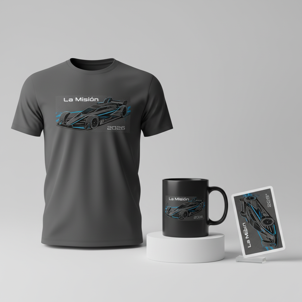 - 👕 Product Selection: The ideal canvas for this sophisticated design is dark apparel. Black, charcoal, or deep navy garments will allow the carbon fiber textures to truly shine, while making the vibrant accent color and the crisp “La Misión 2026” typography pop with maximum contrast and impact, echoing the sleekness of high-performance racing machinery.