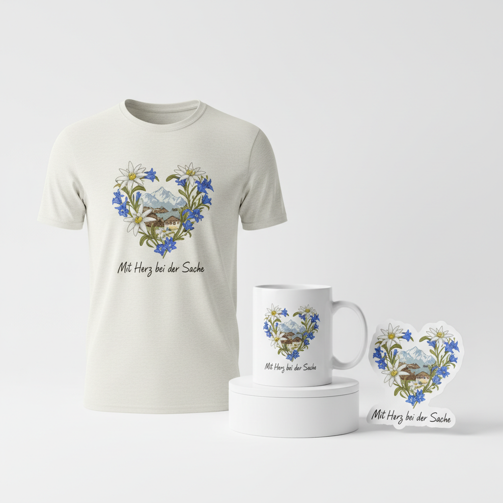 The design cleverly uses universal symbols and aesthetics strongly associated with the show’s themes and setting. The alpine flowers, quaint village silhouette, and the phrase “Mit Herz bei der Sache” all evoke the spirit of the series – community, nature, and heartfelt dedication – without directly infringing on copyrighted elements. This allows fans to connect with the show’s essence on an emotional level.
