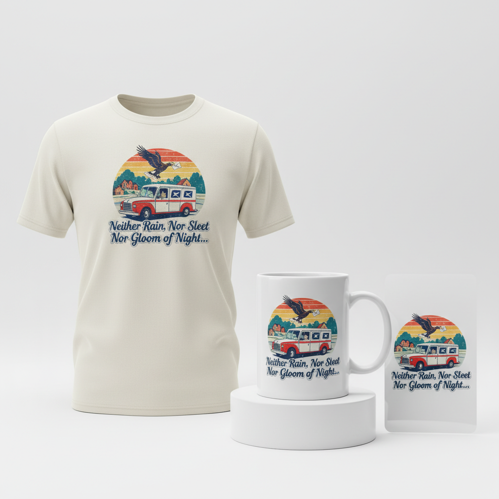 This design is a statement for an engaged audience: Americans with a profound sense of nostalgia and appreciation for USPS reliability and history. This includes those who cherish sending letters, small business owners reliant on mail, and citizens respecting their mail carriers. The iconic unofficial motto, “Neither Rain, Nor Sleet, Nor Gloom of Night…”, acts as a powerful psychological trigger, evoking duty, perseverance, and commitment. This fosters pride and support for an essential national service, identifying buyers with these core American values.
