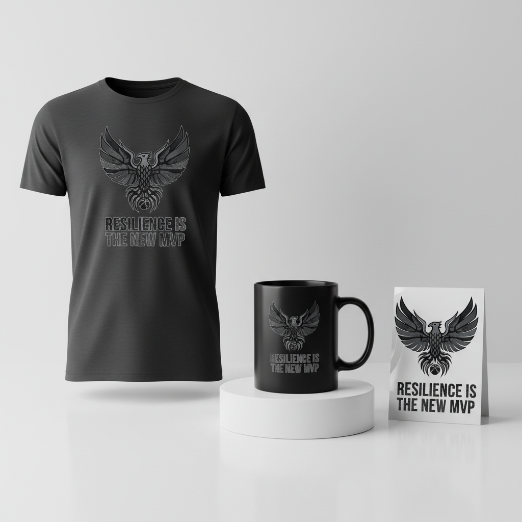 - ✍️ Typography: Below the striking phoenix, the text “Resilience is the new MVP” is presented in a bold, condensed, sans-serif font. The choice of typography is critical here – it’s distressed and features a gritty texture, reflecting the toughness and struggle inherent in overcoming a career-threatening injury. A subtle gradient from dark grey to a slightly lighter grey gives the text a stone-like, resilient appearance, further reinforcing the theme of endurance and unyielding strength.