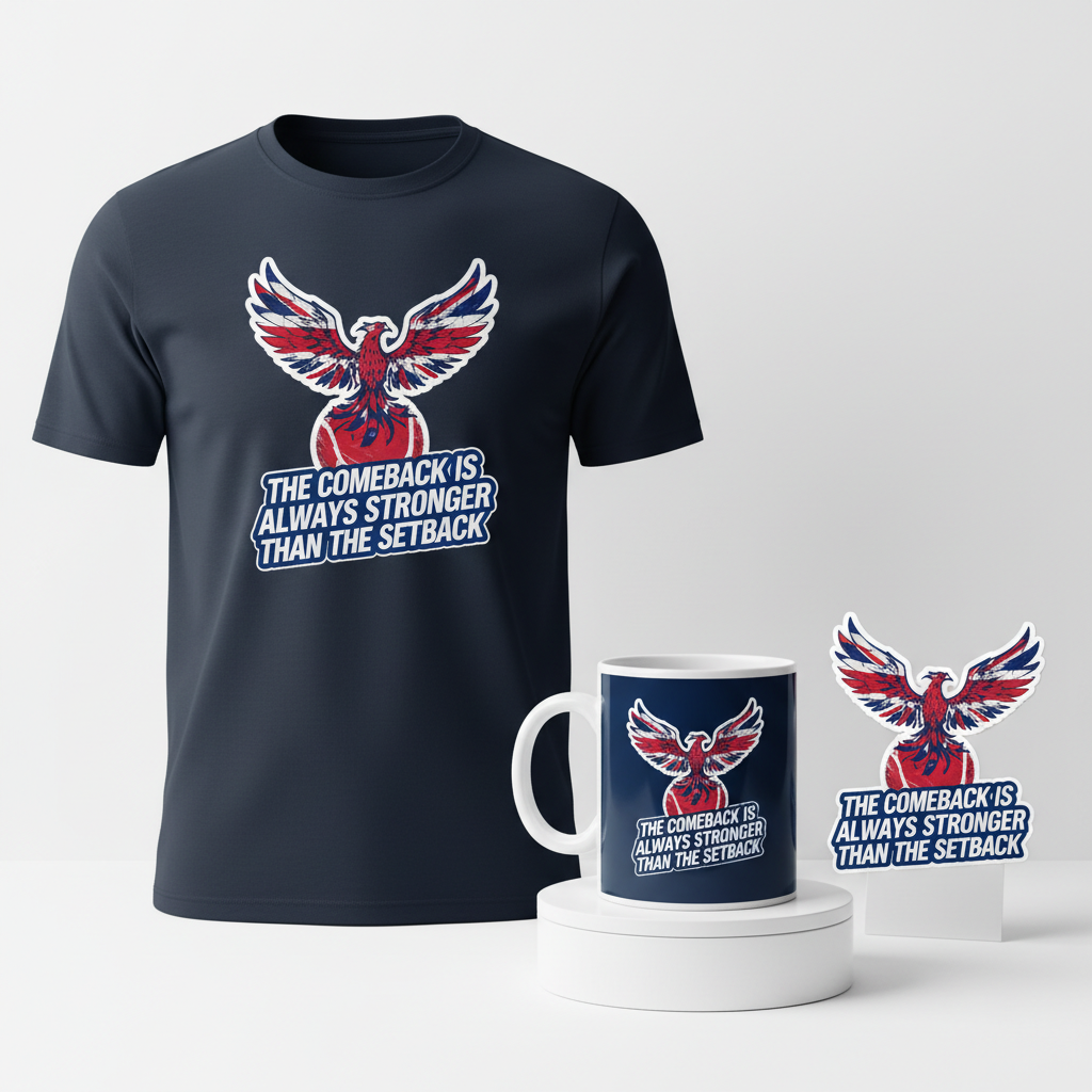 This design ingeniously targets British tennis fans and supporters of Emma Raducanu without infringing on personal likeness or branding. The phoenix motif is a brilliant psychological trigger, tapping into the collective memory of her struggles and her inspiring return. Itβs an emblem of triumph over adversity, a message that transcends sports and speaks to universal human experiences. The motivational quote reinforces this, making the apparel not just a fan item, but a personal statement of resilience. By using the Union Jack colors, the design directly appeals to national pride, allowing fans to wear their support for their country and its rising star in a subtle yet powerful way during her tournaments. This approach ensures broad appeal while maintaining a clear, emotional connection to the specific cultural moment.