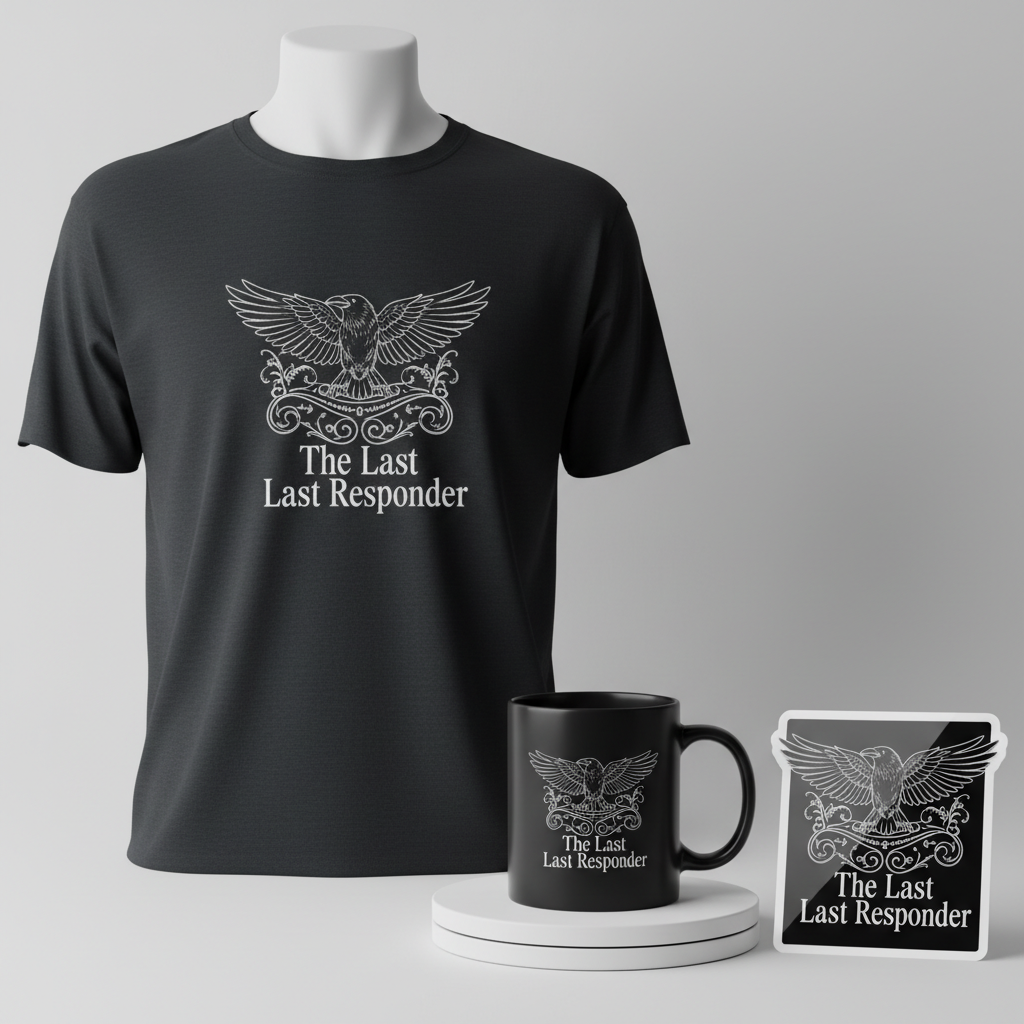 - ✍️ Typography: Complementing the visual, the design utilizes a sophisticated, classic serif font for the text “The Last Responder.” This choice of typography conveys professionalism, tradition, and gravitas. Rendered in a bone-white color, the text stands out crisply against darker backgrounds, creating a striking contrast that is both legible and aesthetically pleasing, reinforcing the elegant gothic theme.