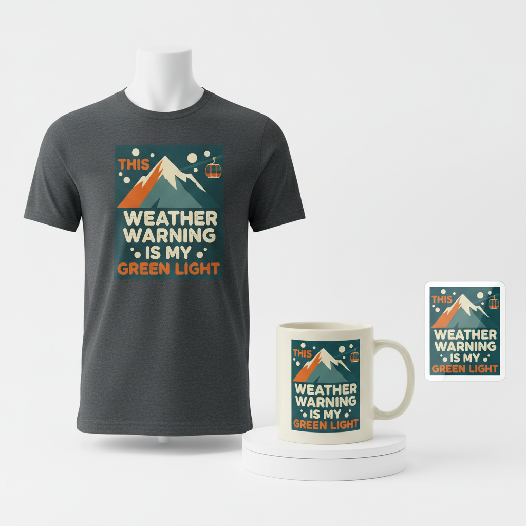 - ✍️ Typography: The chosen typography is bold and rounded, reminiscent of classic ski resort branding, but with a slight texture to impart a weathered, vintage feel. This subtle detail enhances the retro appeal, making the design feel like a cherished piece of memorabilia. The centerpiece text, “This Weather Warning is My Green Light,” perfectly encapsulates the core sentiment of the target audience, turning a cautionary message into an anthem of excitement.