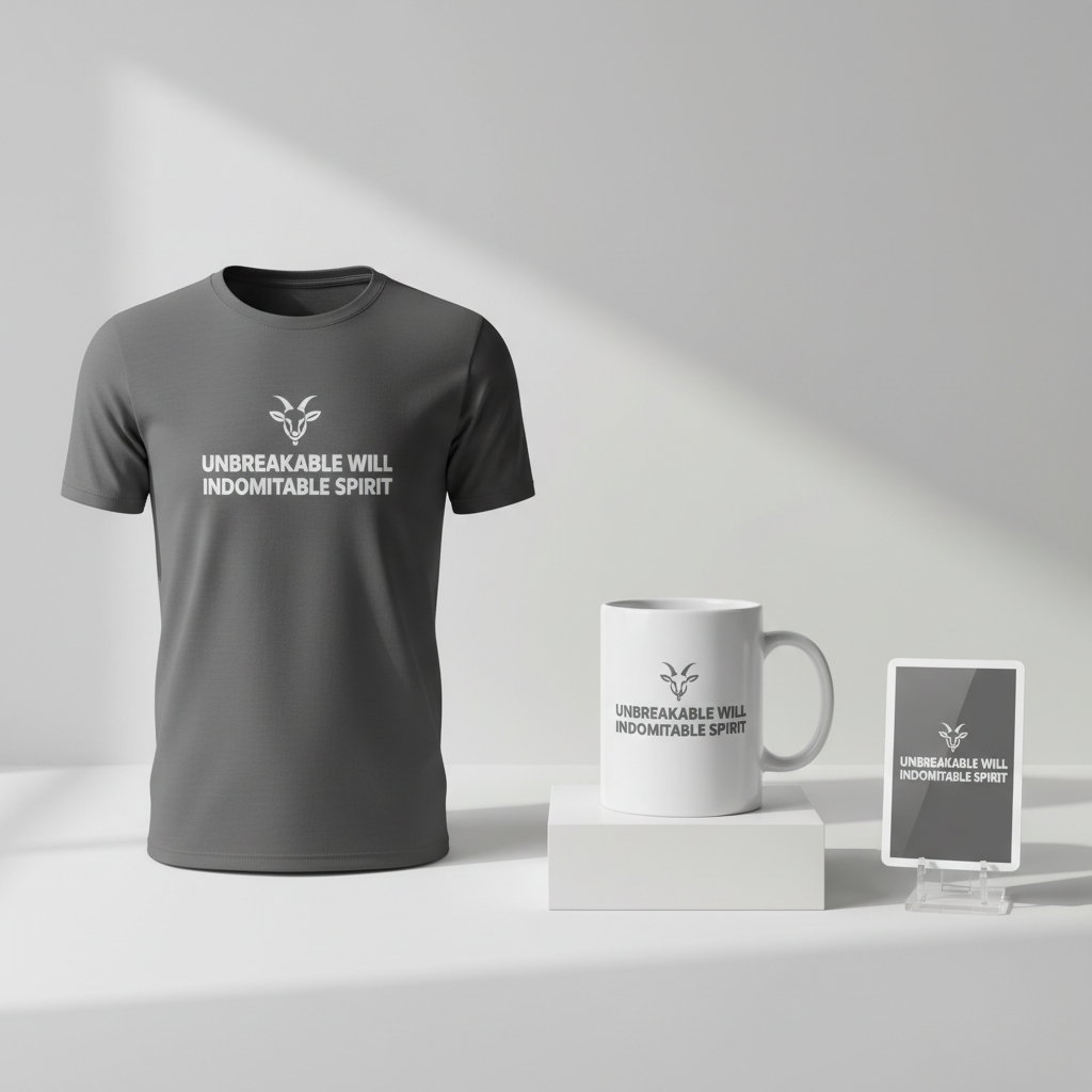 This design ingeniously bypasses copyright concerns by focusing on universal themes and abstract imagery. It uses generic, descriptive words (“UNBREAKABLE WILL INDOMITABLE SPIRIT”) that are not specific to any individual or trademarked entity. The goat’s head icon is stylized and abstract, not a direct likeness, and the acronym “GOAT” is not explicitly used. This approach allows fans to make the connection to their idol’s well-known attributes without infringing on intellectual property.