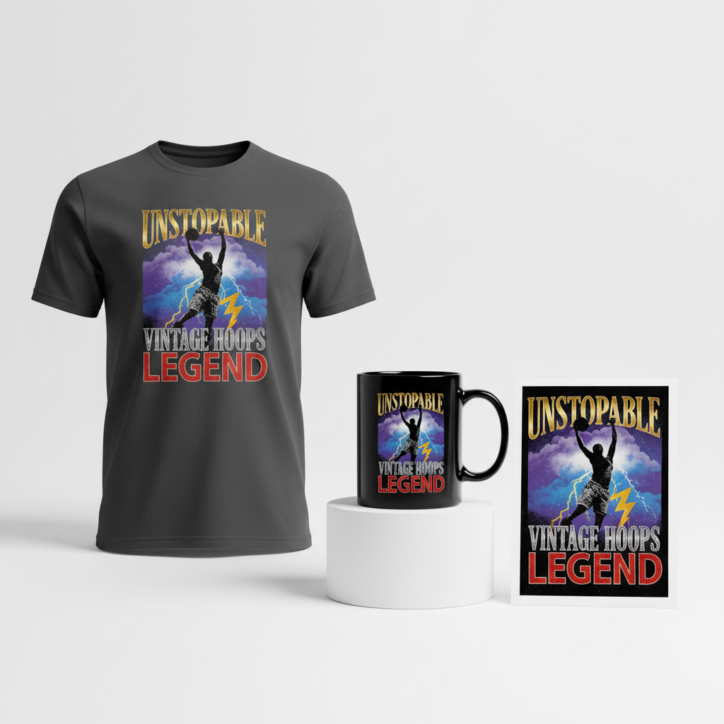 Copyright Evaluation: The design is entirely generic. It uses a non-specific player silhouette, common basketball-related imagery (lightning), and generic, descriptive text. No trademarks belonging to the NBA, specific teams, or players are used. The phrase ‘Unstoppable Vintage Hoops Legend’ is descriptive and not a registered trademark.